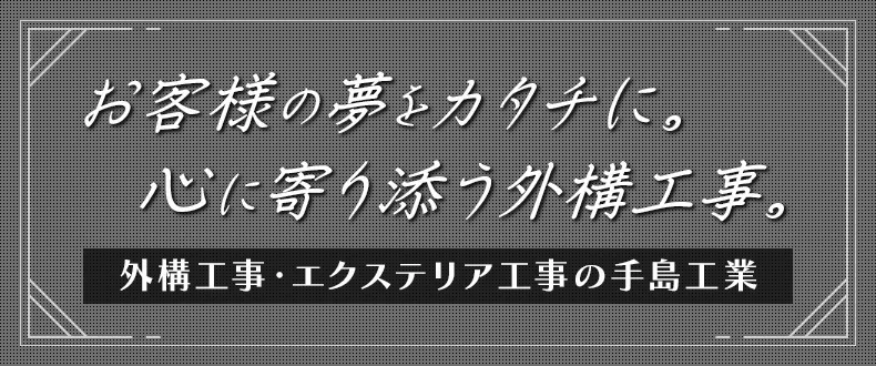 手島工業のホームページをご覧いただき誠にありがとうございます。弊社は、戸建て住宅やアパートをはじめとした一般住宅を対象に、リフォームや新築に伴う外構工事やエクステリア工事などを手がけております。千葉県八千代市を拠点に、千葉県内で幅広く活動しています。弊社では、お客さまのライフスタイルやご要望に合わせて、快適で居心地の良いお住まいを提供することを目指しております。そのために、お客さまからのご要望を丁寧に伺い、最適なプランニングをご提案することを大切にしています。また、お見積もりやご相談は無料で承っておりますので、お気軽にお問い合わせください。弊社スタッフが一丸となって、お客さまの理想の住まいづくりをサポートし、快適な暮らしを実現できるよう努力してまいります。手島工業をどうぞよろしくお願いいたします。