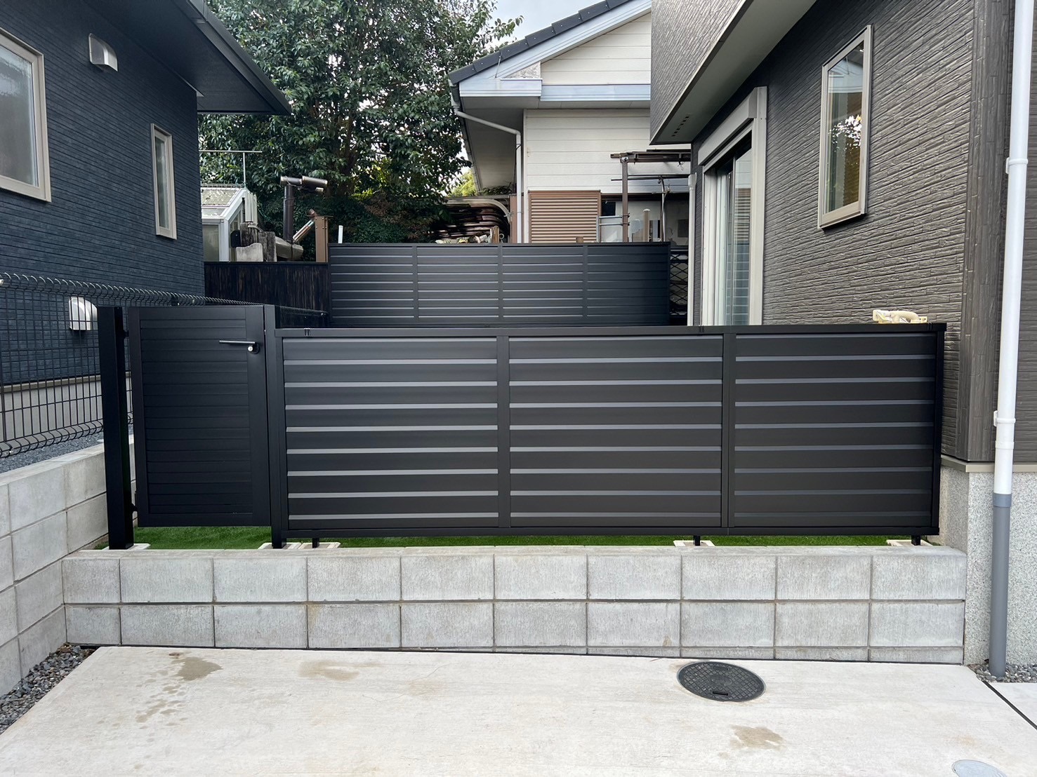 今回はお庭のリフォーム工事をご紹介致します。 施工前は土の状態でしたが、目隠しフェンス、門扉、人工芝を施工致しました。 お客様からのご要望として裏の視線を無くしたいとの事でしたので2mのフェンスを採用し視線を遮断、土の部分には人工芝を施工しました。 手島工業ではこのようなリフォーム工事も施工可能ですので是非お問い合わせ下さい。