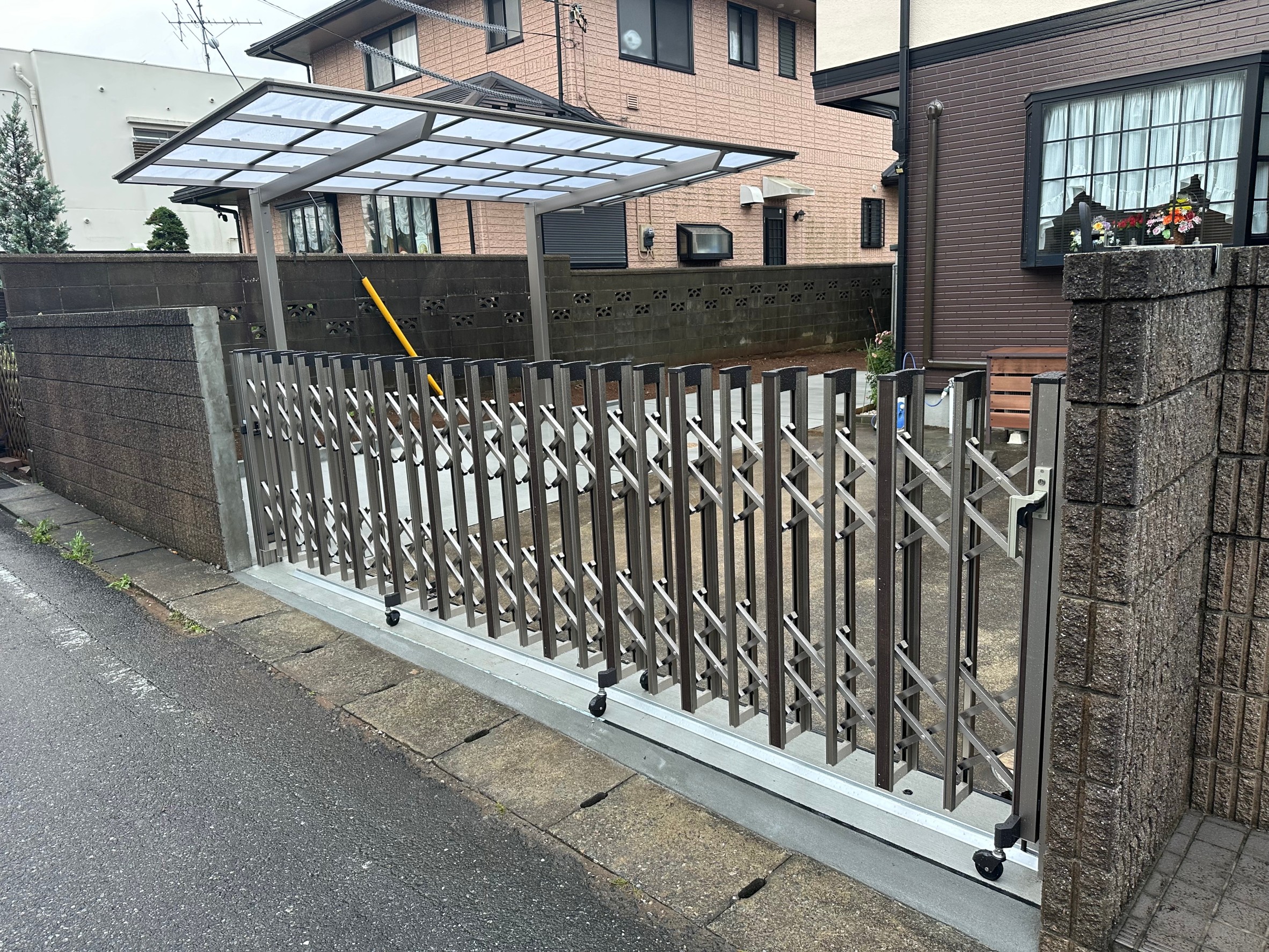 今回は、カーポート、伸縮門扉、門扉、土間コンクリートの施工を行ないました。